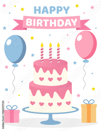 Happy birthday poster design. Birthday greeting with balloons, cake and gift box. Vector Illustration.
