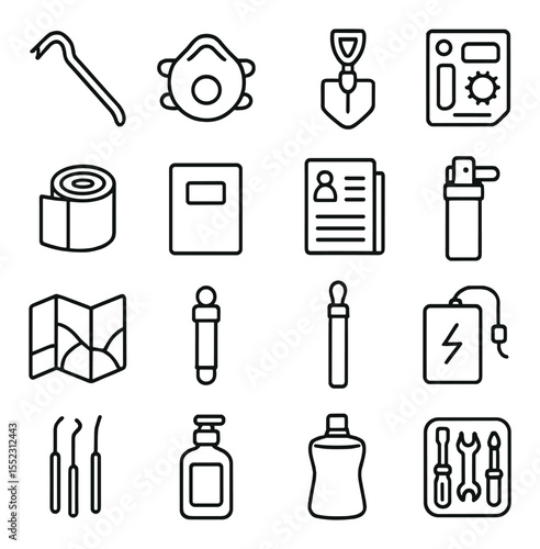 Fire tools for fire prevention, fire safety, firefighters, hydrant steering wheel ax shovel alarm fire extinguisher siren crowbar fireman on white background eps10