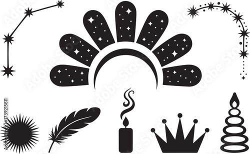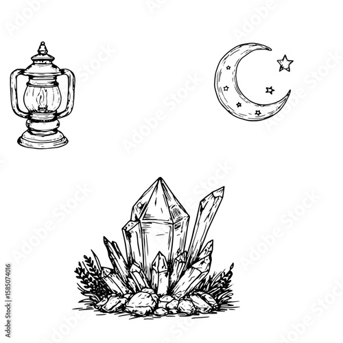 Witchcraft set, mystic magical symbols, hand drawn mystery collection, modern boho style elements for print design crystal, tarot cards, potion.