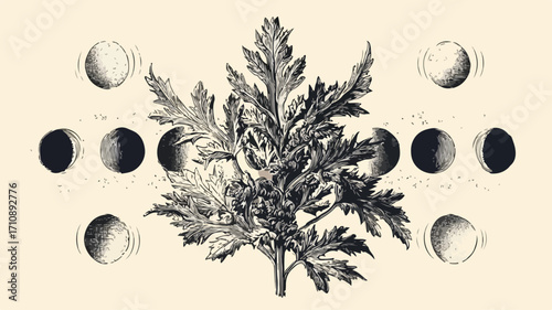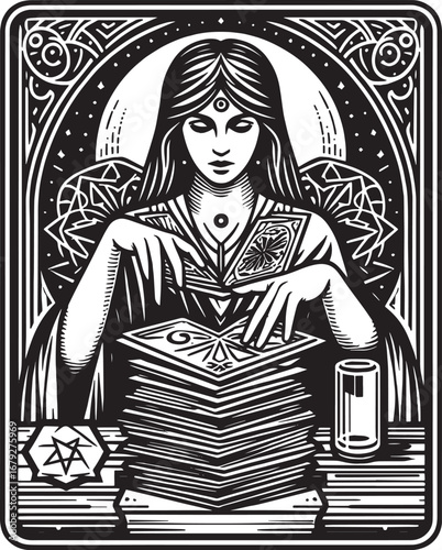 Vintage engraved illustration of fortune teller with crystal ball for mystical designs