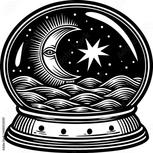 A crystal ball with geometric patterns sitting on a pedestal in a simple black and white line drawing