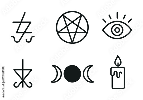 Magic icons set: wand, crystal, potion, tarot, fire, book, feather, cauldron