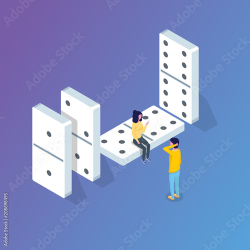 Domino effect or business resilience metaphor vector illustration. Adult young man pushing falling domino line business concept of problem solving.