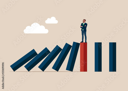Businessman stopping falling domino. Symbol of crisis, risk, management, leadership concept. Vector illustration.