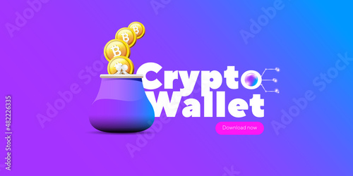 Cryptocurrency wallet concept illustration with wallet and crypto coins isolated on violet background. Crypto wallet landing page and poster design template. Crypto wallet for bitcon, solana, ethereum