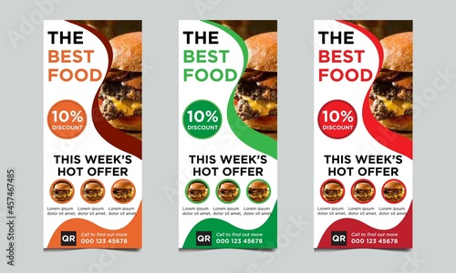 Healthy fast food business marketing roll up or x banner template design with abstract background, restaurant logo and icon. Pizza, burger or hamburger sale rack card & flyer. Food menu poster.