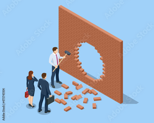 Isometric Breaking the Wall. An alternative Solution to the Problem. Businessman Solved Problem, New Solution, Success and Leadership. Breakthrough. Business concept