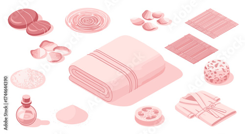 Spa Essentials Icons. Isometric Flat icon set of spa and wellness experiences: massage oil bottle, scented candle, bathrobe,