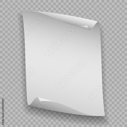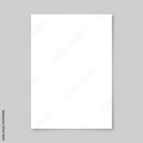 Realistic blank paper sheet with shadow in A4 format isolated on transparent checkered background. Notebook or book page. Design template or mockup. Vector illustration.