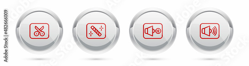Set line Music or video editing, Photo retouching, Speaker volume and . Silver circle button. Vector