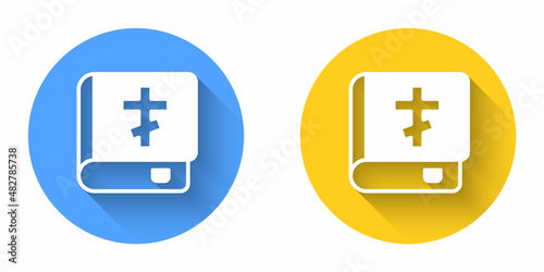 Isometric Holy bible book icon isolated on blue background. Blue circle button. Vector