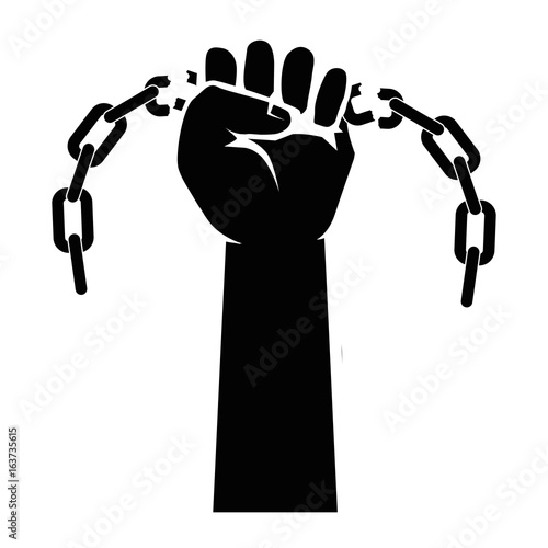 Strong hand clenched fist fighting for freedom against chain slavery theme illustration, vector logo or tattoo, getting free, struggle for liberty.
