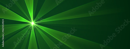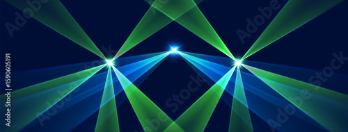 Green lasers background., glowing rays or neon beams, bright futuristic backdrop. Concert or nightclub spotlights. Vector illustration.