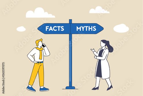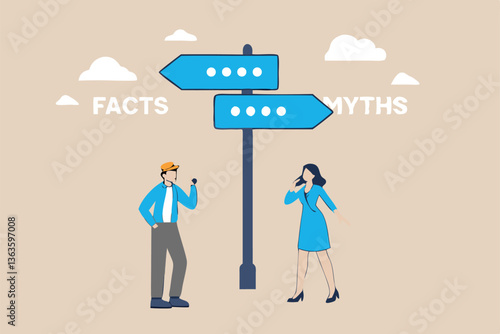 Fact vs Myth, truth or false information to make decision, belief or fiction to choose to believe, trustworthy, fraud or wrong direction concept, business people at Facts vs Myths directional sign.