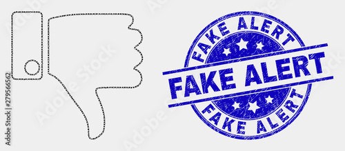 Pixelated thumb down mosaic pictogram and Fake Alert seal. Blue vector rounded scratched stamp with Fake Alert message. Vector combination in flat style.