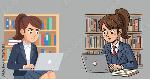 Work of woman in different poses in front of office computer vector illustration. Cartoon businesswoman sitting at desk, professional manager showing gestures, employee working isolated on white
