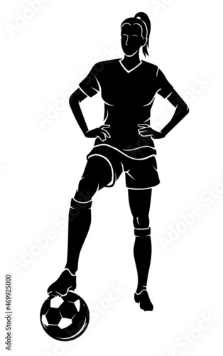 Silhouette of female football player, soccer athlete kicking the ball. Vector logo illustration.