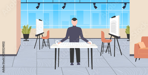 man architect working with blueprint engineer drafting new building model urban panning project concept modern draftsman studio interior full length horizontal