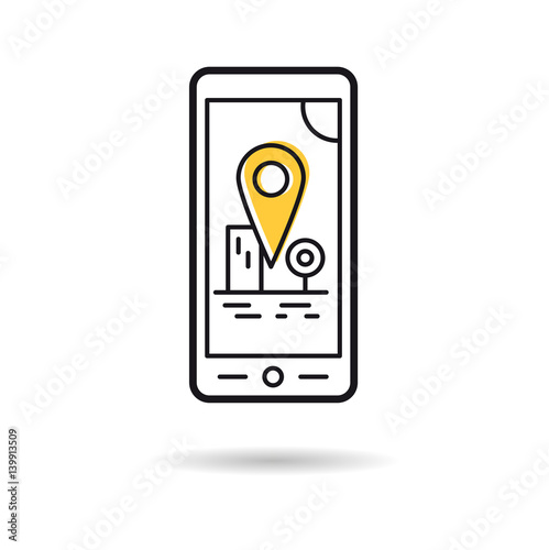 Mobile phone with map marker. Touchscreen smartphone. Concept of route, landmark, adventure, explore. Vector illustration.