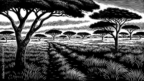 A black and white sketch vector of a savannah with acacia trees background
