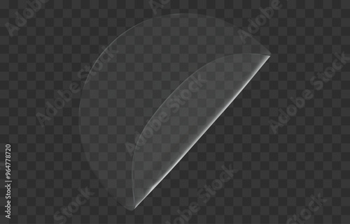 Vector blank transparent plastic square adhesive sticker mock up with curved corner. Empty quadratic sticky label banner mockup with fold. Clear adherent tag template for glass surface.