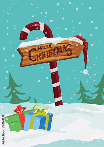 Merry Christmas, paper roll tree shape, black gift box gold ribbons, candy cane, pine leaves and gold ball banner design on red and green background, Eps 10 vector illustration