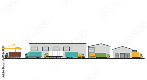 Industrial logistics with cargo trucks and warehouse buildings in flat style
