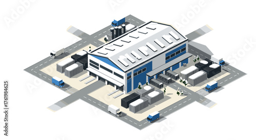 Modern industrial warehouse building with loading docks and vehicles isometric design