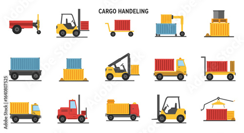 Cargo handling equipment set: forklifts, cranes, containers in flat style