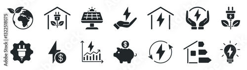 "Energy efficiency icon set. Calculator, energy-saving light bulb, piggy bank, solar panel, circular economy, battery, home insulation, energy class vector illustration.