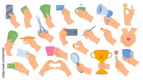 Set Human Hands Hold Different Mugs with Hot and Cold Refreshing Drinks Coffee, Soda, Tea or Juice Beverages in Cups