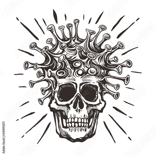 Illustration of human skull with arrow in head. Design element for logo, label, sign, emblem, poster. Vector illustration