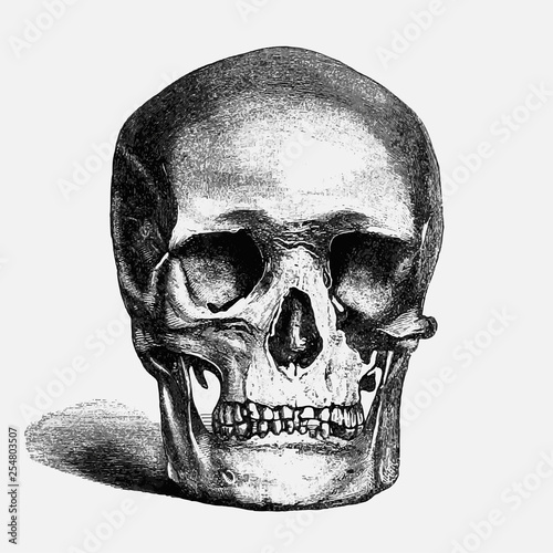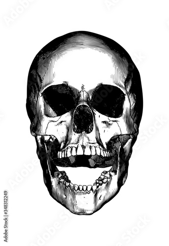 Realistic human skull in the style of vintage engraving. Color retro hand-drawn vector illustration.