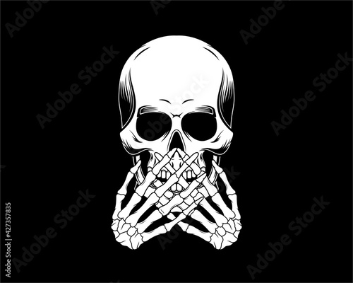 Set of Skulls crossbones, made of hands with gestures or in the frame made of hands bones. Occult witch craft magic portrait of the dead human head. Handmade detailed drawing. Vector illustration.