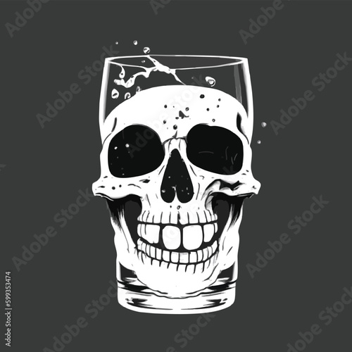 Black and white human skull with splatter effects, isolated on a dark gray background. Front view, ink and paint grunge texture. Vector illustration of graphic art, hand-drawn, for a T-shirt design