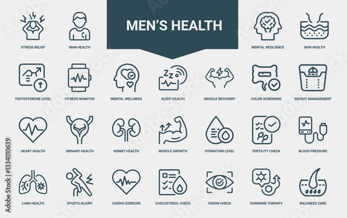 themed icon set focused on aspects mens health well-being, health level kidney muscle growth fertility check hydration