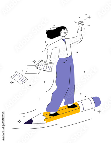 Vector illustration of happy girl carrying a big pencil