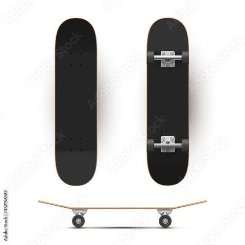 Skateboard template. Realistic black and white skateboard mockup. Vector illustration isolated on white background