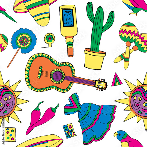 Seamless pattern with hand drawn Mexican food - chili pepper, tacos, burritos isolated on white. Sketch. Cinco de Mayo