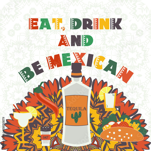 Eat, drink and be Mexican festive card with ethnic ornament pattern. Travel to Mexico traditional symbols, food (chili pepper, taco, tequila, salt, lime, shot drink) icons set for cards, banners.