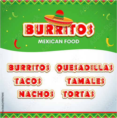 Menu elements for mexican restaurant. Mexican food flyer, brochure template. Burritos, tacos nachos, quesadilla, tamales, tartos logo templates. Isolated vector illustrations.