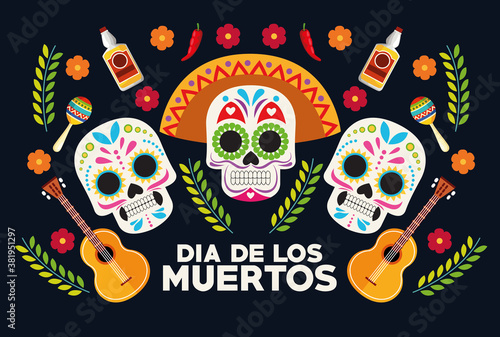 dia de los muertos celebration poster with skulls heads group and guitars