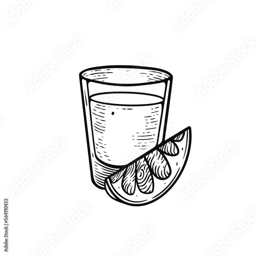 Tequila shot with lime and salt. Vector illustration in doodle style isolated.