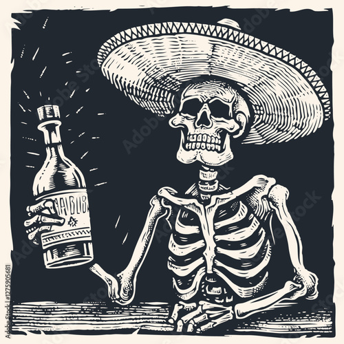 Vector illustration of a skeleton in a sombrero holding a bottle of tequila. Great for Dia de los Muertos, party, or bar designs. Dark humor and vintage style.