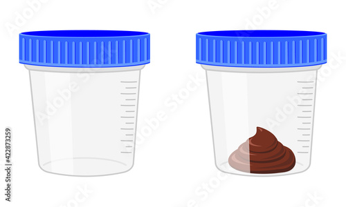 Stool sample, empty and full plastic cups. Poop analysis. Laboratory examination concept. Vector cartoon illustration.