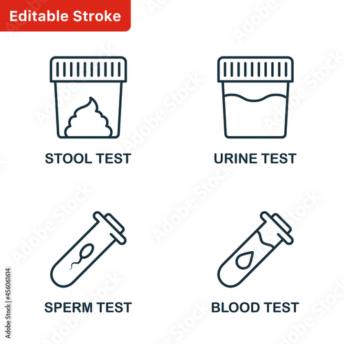Medical laboratory blood, urine, sperm and stool test editable stroke outline icons set isolated on white background flat vector illustration. Pixel perfect. 64 x 64.