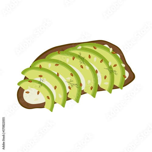 Avocado toast. Fresh toasted dark rye bread with slices of ripe avocado. Delicious avocado sandwich with sesame seeds, seasoning and dill. Vector illustration.