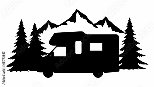 A black silhouette of a tent and pine trees with the words Happy Camper, isolated on a white background.