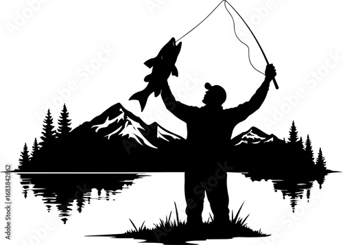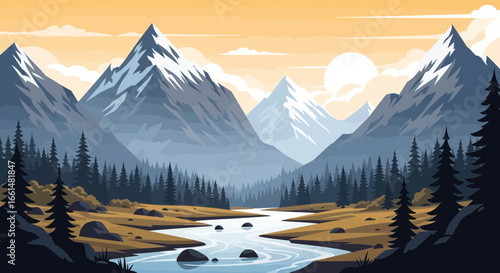 Serene mountain landscape with reflection on calm lake and pine trees, digital artwork