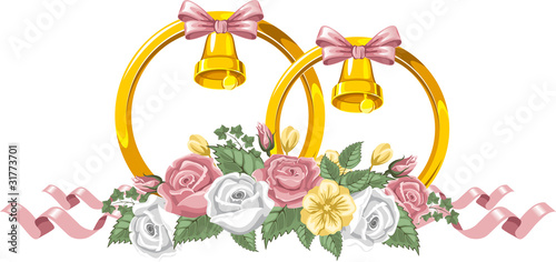 Wedding bells with hearts and a pink bow in a gold frame with a floral oriental ornament. Illustration of white background